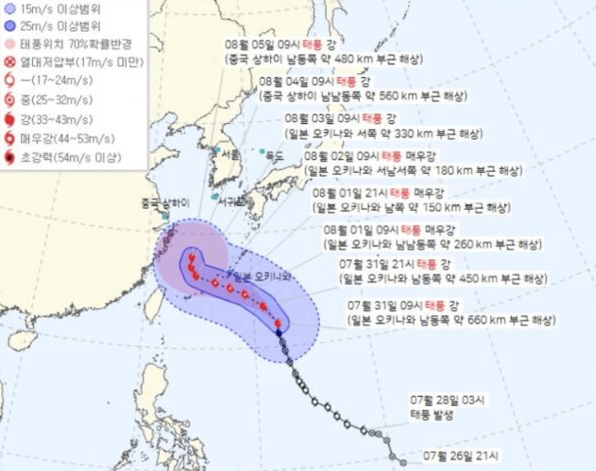 태풍 카눈(Kanun)은 예상치 못한 예상 경로 변경으로 헤드라인을 장식하고 있습니다. 이전에 중국 상하이 남쪽에 상륙할 것으로 예상되었던 한국 기상청의 최신 정보는 다른 궤적을 보여주고 있습니다. 현재 카눈의 세력은 '강'으로 분류되었다.